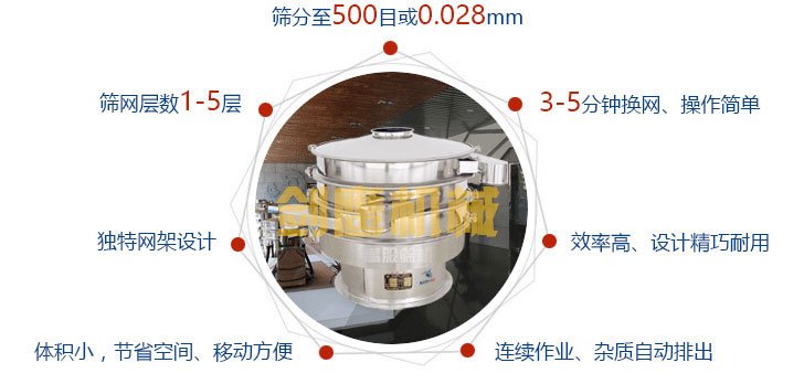 特点:任何颗粒、粉末、粘液一定范围内均可筛选。筛分*细至500目或0.028mm,
